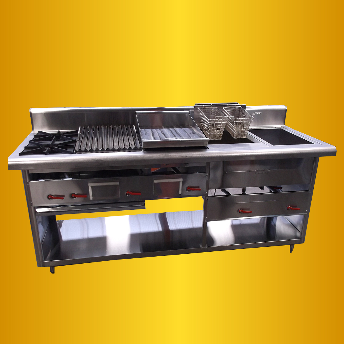 - Plancha asadora construida en lamina de acero al bajo carbono espesor 1/2″ sistema de calentamiento quemadores tipo flauta de 25.000 btu/hora