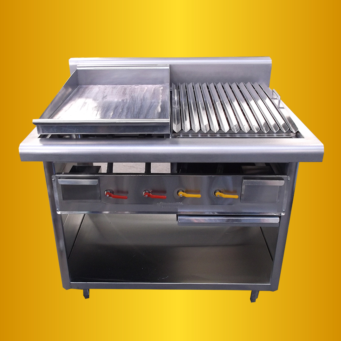 Plancha asadora y grill a gas fabricados en estructura reforzada de acero, con patas en tubo inoxidable y regatones regulables. Laterales en acero inoxidable, soldadura TIG y válvulas de control italianas. La plancha es de acero al bajo carbono de 1/2″, con quemadores tipo flauta (25.000 BTU/h). El grill incluye quemadores, piedra volcánica y parrilla para calentamiento.