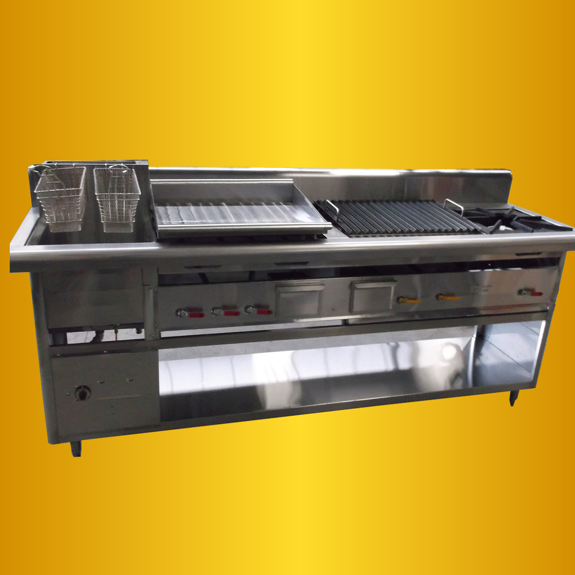 - Plancha asadora construida en lamina de acero al bajo carbono espesor 1/2″ sistema de calentamiento quemadores tipo flauta de 25.000 btu/hora